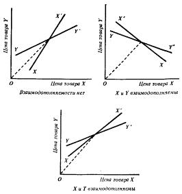 Рис. 16. Все эти положения характеризуются стабильностью Отложим на осях координат цену товара X и цену товара У. Тогда всякая точка на графике будет представлять определенную пару цен. Произвольно выбрав цену товара У, мы можем определить цену товара X, при которой спрос на товар Х и его предложение сравняются, и тем самым на рынке товара Х установится равновесие. (Разумеется, рынок товара У не обязательно окажется также в состоянии равновесия.) Таким образом, мы можем найти пару цен, при которых на рынке товара X установится равновесие. Отметим на графике соответствующую точку, а затем несколько подобных точек, начав о произвольных цен товара У. Эти точки образуют кривую, которую назовем XX'. Что можно сказать о форме этой кривой? На вопрос, вызовет ли повышение цены товара У рост цены товара Х или нет, можно отвечать в зависимости от того, как при этом ведет себя кривая избыточного спроса на товар X. Если эта кривая повышается, то цена товаpa X должна возрасти, а для кривой XX' значения производной во всех точках будут положительны; если же эта кривая понижается, соответствующие значения производной будут отрицательны. Однако цена товара У определяет, как и прежде, поведение кривой избыточного спроса на товар Х благодаря эффекту дохода и эффекту замещения. По тем же самым причинам, что упоминались в § 2, можно предполагать, что эффект дохода, связанный с избыточным спросом, окажется во многих случаях небольшим (ведь он включает две составляющие, которые действуют в противоположных направлениях). Благодаря эффекту замещения избыточный спрос на товар X, если Х и У - заменители, увеличится и уменьшится, если они взаимодополняемы. Здесь предполагается, что отношения заменяемости и дополняемости характерны для всего рынка, для покупателей и для продавцов. Таким образом, если (в качестве приближения к решению вопроса) пренебречь эффектом дохода, то мы можем с известной вероятностью утверждать, что XX' будет повышаться, когда товары Х и У являются заменителями, и понижается, когда эти товары взаимодополняемы. Теперь сосредоточим ненадолго внимание на тех случаях, когда XX' повышается. Наклон кривой зависит от относительного влияния цен двух товаров на избыточный спрос на товар X. (Если цена товара Х имеет в данном случае большее значение, то повышение цены товара У приведет к сравнительно небольшому повышению цены товара X.) Эластичность кривой XX' будет меньше единицы. Больше единицы эластичность этой кривой окажется тогда, когда цена товара У будет определять избыточный спрос на товар Х относительно сильнее, чем цена самого товара X. Есть возможность с той или иной степенью точности определить, какова вероятность каждого из двух названных случаев. Для этого посмотрим, что произойдет, если цена товара Х и цена товара У увеличивались одинаково, так что соотношение цен товаров Х и У осталось без изменения. Как мы уже видели, это приводит к совершенно таким же последствиям, как и снижение в равной пропорции цен на все прочие, кроме Х и У, товары (включая стандартный товар); последние можно, таким образом, объединить и рассматривать как единый товар Т. При этом (эффект дохода вновь не принимается во внимание) падение цены товара Т должно привести к уменьшению избыточного спроса на товар X, если только этот товар не дополняет товар Т. Итак, всегда, за исклю