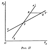1. Законы изменения системы цен, как и законы изменения индивидуального спроса, необходимо выводить из условий стабильности. Сначала мы исследуем вопрос о том, какие условия необходимы, чтобы данная система равновесия сохраняла стабильность, затем введем предположение о наличии регулярных взаимосвязей, согласно которому состояние системы, близкое к равновесному, также является стабильным. Вслед за этим мы выведем правила, в соответствии с которыми система цен должна реагировать на изменения в характере потребительских вкусов и объеме ресурсов. Что подразумевается под стабильностью обмена? Для стабильности состояния равновесия необходимо, чтобы малейшее отклонение системы от этого состояния вызывало к действию силы, стремящиеся восстановить равновесие. Это означает, что превышение цен равновесного значения неизбежно порождает действие сил, стремящихся снизить цену; для условий же совершенной конкуренции сказанное подразумевает, что рост цены ведет к расширению предложения по сравнению со спросом. [Можно заметить, что это условие не совпадает с условием, приводимым Маршаллом в «Принципах...». Маршалл говорит: «Равновесие между спросом и предложением, соответствующее точке пересечения кривых спроса и предложения, является стабильным или нестабильным в зависимости от того, находится ли кривая спроса выше или ниже этой точки непосредственно слева от нее...» (А. Маршалл. Принципы политической экономии); иначе говоря, незначительное сокращение выпуска продукции приводит к тому, что цена спроса становится выше цены предложения. Данное условие стабильности не идентично тому, что приводится выше; оно все-таки в большей мере справедливо для монополии, чем для совершенной конкуренции. При монополии равновесие стабильно, если небольшое сокращение выпуска продукции приводит к тому, что предельный доход начинает превышать предельные издержки. Тот случай, когда предложение описывается кривой, «понижающейся при перемещении вправо по оси абсцисс» (это обозначение г-на Кана), который, как полагал Маршалл, согласуется с устойчивым равновесием, не согласуется с устойчивым равновесием в условиях совершенной конкуренции.] Условие стабильности состоит в том, что рост цены приводит к большему расширению предложения по сравнению со спросом, а падение цены - к большему расширению спроса по сравнению с предложением. С помощью теории обмена можно не просто выявить условия стабильности системы и вывести из этих условий законы изменения. Ведь поскольку теория обмена основывается на теории спроса, можно исследовать вопрос о том, насколько стабильность обмена согласуется с теорией спроса, разработанной в гл. II и III настоящей книги. Используя такого рода подход, мы получаем возможность узнать о функционировании системы цен гораздо больше, чем при ином подходе. 2. Начнем с простого обмена двумя товарами. Мы не можем ожидать в этой хорошо разработанной области исследования каких-нибудь новых результатов, однако, заново представляя знакомую теорию в терминах, которые применяются в нашем собственном анализе, мы можем надеяться облечь эту теорию в форму, позволяющую сделать обобщения. Если ведется торговля только двумя товарами (X и У), то условие равновесия состоит в том, что предложение товара Х совпадает со спросом на товар X, а условие ста