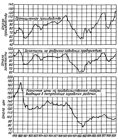 Рост и потрясения В середине XX в. с резкой отчетливостью выступают две характерные особенности американской экономики. Одна из них — это внушительное зрелище нарастания производственной мощи. В 1950 г. физический объем произведенных товаров и услуг превышал (округленно) объем 1900 г. почти в 6 раз, а в расчете на душу населения — в 3 с лишним раза. Америка стала индустриальным гигантом. Ее экономические достижения времен второй мировой войны привели в изумление весь мир. Второе, что поражает в развитии экономики США, — это титанические потрясения, через которые она прошла в это роковое пятидесятилетие. Национальный доход двигался вверх и вниз — и снова вверх — в форме массивных волн прилива и отлива. Он увеличился с 30 млрд. долл. в 1910 г. до 87 млрд. в 1929 г.; затем последовало падение до 40 млрд. в 1933 г. и новое повышение до 225 млрд. в 1948 г. Индекс оптовых цен, повысившийся с 65 в 1911 г. до 155 в 1920 г., ринулся затем вниз до 65 в 1932 г. — лишь с тем, чтобы в 1948 г., достигнув 165, превысить прежний максимальный годовой уровень. Объем занятости увеличился с 36 млн. человек в 1911 г. до 48 млн. в 1929 г.; затем он снизился до 39 млн. в 1932 г. и вновь увеличился до 61 млн. в 1948 г. Описание движений подобного размаха при помощи таких терминов, как "колебания" или "циклы", представляется преуменьшением масштабов этих явлений. В XX в. "цикл" был подлинным образом захлестнут колоссальными потрясениями. Для описания этих явлений больше подошла бы, возможно, старая и более красочная терминология — бум и крушение, инфляция и дефляция, кризис и стагнация, взлет и крах. В мире, где нам пришлось жить, испытываешь нерешительность, когда берешься писать книгу об экономических циклах. Цикл и структурное равновесие В наше время часто встречается представление, будто экономический цикл свидетельствует о патологическом состоянии хозяйства, которое может быть легко исцелено при осуществлении определенных структурных изменений. Если удастся найти, говорят нам, точку равновесия в соотношении заработной платы и цен, улучшить отношения между предпринимателями и рабочими, перестроить налоговую систему и т.д., то экономическая система окажется в состоянии, достаточно здоровом, чтобы оказать сопротивление любой тенденции к резким колебаниям. Это представление, однако, является опасной иллюзией. Для здорового функционирования экономической системы структурное равновесие действительно имеет важное значение. Но тенденция к колебаниям не есть патологическое явление. Она является неотъемлемым свойством системы частного предпринимательства, рыночной экономики. Чтобы стать стабильной, этой системе требуется нечто большее, чем структурные перестройки; ей требуется обдуманная и позитивная программа мероприятий, призванных устранить циклические колебания. Определение цикла В своей работе "Экономические циклы: проблема и ее постановка" (1927 г.) Уэсли Митчелл определяет экономические циклы как колебания совокупной экономической деятельности. Наиболее всеобъемлющим показателем совокупной экономической деятельности является объем реального дохода или продукции страны. С этой величиной тесно связан и объем занятости. Если объем продукции и занятость колеблются, то цены в результате изменений совокупного спроса и предельных издержек производства подвергаются (в различной степени) изменениям. И
