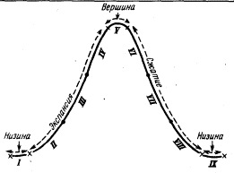 Pис. 3. Четырехфазный цикл (по Шумпетеру) У Бернса и Митчелла поворотные пункты рассматриваются как явления более значительные, чем постепенно усиливающиеся процессы Шумпетера, колеблющиеся вокруг окрестностей точки равновесия. В своей работе "Измерение промышленных циклов" Бернс и Митчелл подразделяют каждый законченный цикл, от низины до низины включительно, на девять стадий. Низина, с которой цикл начинается, обозначается римской цифрой I, низина, которой цикл завершается, — цифрой IX, а вершина — цифрой V. Фаза "экспансия" подразделяется на три стадии, обозначаемые цифрами II, III и IV; фаза "сжатие" подобным же образом подразделяется на три стадии, обозначаемые цифрами VI, VII и VIII. Эта модель может быть графически изображена так, как это сделано на рис. 4.