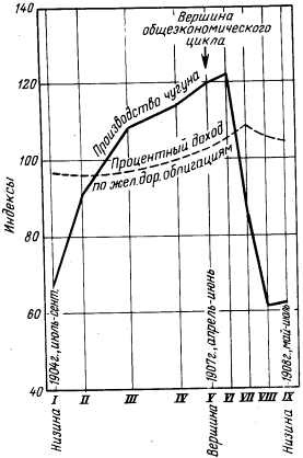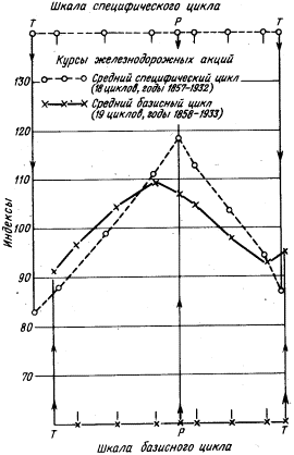 Бернс и Митчелл стремятся вначале обнаружить низины и вершины общей экономической активности. Вслед за этим изучаемый промежуток между вершиной и низинами подразделяется на периоды общей экспансии и общего сжатия, как это показано выше на примере цикла 1904-1908 гг.; то же относится и к любому другому циклу. После установления определенных хронологических границ вершин и низин последовательных экономических циклов исследуется поведение каждого частного статистического ряда (например, производства чугуна) в рамках циклов общей экономической активности. Базисные и специфические циклы Каждый частный временной ряд (доходы от облигаций, безналичные расчеты, курсы акций, продажа акций, заявки на товарные вагоны и многие другие) укладывается в рамки девяти стадий общего экономического цикла. Это образует "базисный цикл" для каждого ряда. Средний для всего базисного цикла объем, скажем заявок на товарные вагоны, берется за 100, а цифры, относящиеся к каждой из девяти стадий, выражаются в процентах к этой средней. Сделав это, можно затем легко высчитать типический базисный цикл; это делается путем выведения из индексных чисел средних, относящихся к каждой из девяти стадий, взятой на протяжении нескольких последовательных циклов. В дополнение к сказанному каждый частный ряд анализируется с точки зрения "специфических" циклов, которые отделяются друг от друга низинами и вершинами этого особого ряда. Каждый такой цикл подразделяется на девять стадий. И опять-таки последовательные специфические циклы каждого ряда усредняются в "типические" специфические циклы. Эта система отношений иллюстрируется на рис. 5, где специфический цикл (усредненные данные 18 циклов движения курсов акций) нанесен пунктиром на линию базисного цикла (усредненные данные 19 циклов).