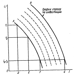 Рис. 37. Смещения графика спроса на инвестиции Рассмотрим сперва кривую А. До тех пор пока размеры инвестиций ограничены пределами OD, норма предельной эффективности будет равна r1 что намного превышает норму процента I0. Когда размер инвестиций дойдет в конечном итоге до OF, норма предельной эффективности должна будет (предполагая отсутствие изменений в технике и приросте населения) упасть до r3 т.е. до уровня, равного норме процента I0. С этого момента не будет произведено никаких добавочных инвестиций; и такое состояние будет продолжаться до тех пор, пока факторы роста не откроют опять новые возможности инвестирования, вызвав смещение кривой вверх и вправо. Когда говорят, что инвестирование будет продолжаться до тех пор, пока норма предельной эффективности r не будет снижена до уровня процента i, то это надлежит понимать таким образом, что эта норма r свободна от риска. Валовая норма поступлений будет значительно выше, так как обычно приходится делать солидную надбавку на риск. Если исключить эту надбавку, то будет наблюдаться тенденция довести капиталовложения до такого состояния, при котором чистая предельная эффективность инвестиций (из которой вычтены премии на риск) будет приближаться к норме процента, выплачиваемой в данное время по ссудам на рынках капиталов. Инвестирование в период бума Чем больше бывают заполнены каналы инвестиций, тем менее прибыльными являются последующие инвестиции. Примем, что на протяжении, скажем, трех лет бума производятся инвестиции в общей сумме OF (рис. 37), причем OD инвестируется в течение первого года, DE — в течение второго и EF — в течение третьего года. Допустим, что к концу третьего года все благоприятные возможности инвестирования полностью использованы. В сфере инвестиций, следовательно, временно достигнуто состояние насыщения. Норма предельной эффективности новых инвестиций снижена до нормы процента на ссудный капитал. За пределами этого пункта инвестирование становится невыгодным. Следовательно, если благоприятные возможности инвестирования полностью исчерпываются, то происходит резкое сокращение объема инвестиций. Это приводит к серьезной депрессии. Нечто подобное произошло в 1929 г. Валовые инвестиции снизились с 16,6 млрд. долл. в 1929 г. до 1,1 млрд. долл. в 1932г. Технические факторы и рост Но факторы роста вскоре опять откроют новые благоприятные возможности инвестирования. Достижения в области техники, появление новых, снижающих издержки производства машин, возникновение новых продуктов и новых отраслей индустрии, открытие новых природных ресурсов, рост народонаселения вскоре откроют дорогу для дальнейших новых инвестиций. Эти процессы протекают во всякое время, они не прекращаются даже в разгар большой депрессии. Но, несмотря на накапливающиеся потенциальные возможности инвестирования, объем производимых инвестиций может оставаться в течение многих месяцев, а зачастую и в течение нескольких лет относительно незначительным. Этот недостаток инвестиционной активности может быть отчасти объяснен тем обстоятельством, что в течение предшествующего бума во многих областях были, возможно, произведены избыточные инвестиции. Так действительно обстояло дело, например, со строительством зданий под конторы и учреждения во времена бума 1929 г. Отчасти же длительная задержка в восст