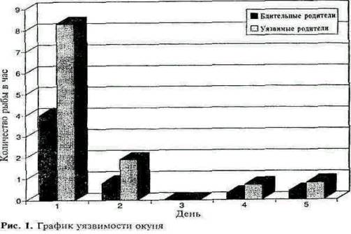 Никогда не забывайте об экологии. Где живет ваш противник? Чем он питается? Хорошая ли у него реакция? Никогда не забывайте о жизненных ритмах. Старайтесь синхронизировать свою деятельность с внешним миром. Все в мире взаимосвязано. Чтобы достичь успеха, уделяйте должное внимание языкам, науке, экономике, литературе, религии и искусству. Вспомните Гамлета: «Александр умер, Александра похоронили, Александр превращается в прах; прах есть земля; из земли делают глину; и почему этой глиной, в которую он обратился, не могут заткнуть пивную бочку?» Если вы хотите понять, чего вы стоите, поучаствуйте в конкурсе или турнире. Но помните, что для победы на конкурсе нужны совсем другие качества и методы, чем для успехов в повседневной жизни. Участнику конкурса нечего терять, поэтому он рискует гораздо больше, чем осмелились бы мы рисковать в житейских делах. Развивайте в себе чувство противоречия. Обнаружив в каком-то месте чемпиона, вы едва ли встретите там другого чемпиона. Лучшая рыба плавает на глубине, и разная рыба ловится на разных червей. Все находится под влиянием погоды. В полнолуние легче всего делать выбор наживки. Ветер - твой друг; но смена направления ветра часто меняет и правила игры, и реакцию добычи. Сохраняйте спокойствие. Держите свои эмоции под контролем. Иначе любой громкий выкрик отвлечет ваше внимание и пошатнет ваши позиции. Время торжествовать наступит тогда, когда вы вернетесь домой и обдумаете, что вы сделали правильно, а что - неправильно. Привыкайте к научным методам работы. Записывайте, какие приемы срабатывают, а какие - нет. Когда вы впоследствии проанализируете эти записи, вы поймете, как изменить свою стратегию, чтобы повысить вероятность успеха. Если ваши дела идут плохо, срочно измените свои методы работы. Но будьте скромны и учитывайте, что в мире существуют гораздо более сильные игроки, чем вы. Учитесь на легендах, которые рассказывают об этих великих людях. Многие из них ведут семинары и с радостью поделятся с вами своей мудростью. Циклы всегда меняются. Прием, который принесет вам победу утром, в полдень окажется почти бесполезным, а вечером - вредным. Когда мне на глаза попались эти советы и афоризмы, поначалу меня охватило отчаяние. Черт побери, меня опередили! Кто-то другой уже открыл за меня главные закономерности игры на бирже и успел опубликовать эти открытия. Но затем я обнаружил, что эти открытия относились вовсе не к игре на бирже! Это были советы начинающему рыболову! Таким образом, приемы рыбной ловли и сама рыба представляют собой важный урок для биржевого спекулянта. Стив Стиглер, мой консультант по статистике, принимал участие в правительственном исследовании под названием «Наследуемые черты уязвимости окуней к рыбной ловле». Результатами этого исследования Стиглер поделился со мной, и это помогло мне усовершенствоваться в спекуляции. Окуни подразделялись на два класса. К первому классу принадлежали те, которые три или более раз ловились на искусственную наживку (и тем самым получали «титул» уязвимых); они представлены на графике серыми столбцами. Во второй класс входили те, которые не ловились вовсе (т.е. бдительные окуни); они изображены черными столбцами. Потомство уязвимых родителей ловилось в два раза чаще, чем потомство бдительных родителей. Вывод исследования таков: «В случае, когда