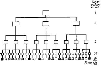Рис. 6. Для организации труда 81 работника в цехе при среднем диапазоне контроля 3 необходимо 5 уровней подчинения и 40 руководителей и управляющих дополнительно Последнее возражение Суойенена против принципа диапазона контроля заключается в том, что этот принцип отрицает роль рабочих групп в сокращении работы по контролю. Он утверждает, что сплоченные рабочие группы, принимающие цели компании как свои собственные, будут сами решать свои внутренние разногласия и формировать свою собственную «политику», уменьшая тем самым необходимость в консультациях со стороны руководителя. Комментарий к критике. Утверждения о неразрешимости конфликта между ограниченным диапазоном контроля и числом уровней представляются сомнительными. Хотя уменьшение числа уровней достигается ценой увеличения диапазона контроля, это изменение может быть произведено без увеличения нагрузки на оставшихся руководителей. Аналогично, хотя уменьшение диапазона контроля увеличивает число уровней, загрузку можно уменьшить и без увеличения числа уровней. Причина этого заключается в том, что работа руководителя не сводится только к распорядительству.