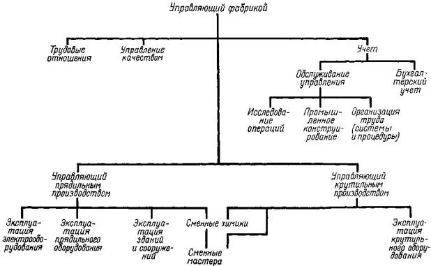 Рис. 11. Первоначальная организационная структура фабрики по производству рейона 1. Решения принимаются не в нужном месте и не на соответствующем уровне. Так, все инженерные службы (главного энергетика, главного механика и эксплуатации зданий) являются общефабричными. Поэтому эти службы должны либо подчиняться общему координатору непосредственно, либо группироваться в сектора, руководители которых подчиняются этому общему координатору. 2. Для достижения координации используются неэффективные методы. В связи с тем, что различные инженерные службы функционируют как общефабричные и их координация необходима в масштабах всей фабрики, сложилась неформальная система координации. Но такая система неэффективна и запутывает иерархию руководства (например, когда главный механик взаимодействует непосредственно с управляющим фабрикой). Это может привести к несогласованности действий руководителей, когда управляющий фабрикой дает распоряжения подчиненным другого руководителя, создавая путаницу. 3. Координация между службами несовершенна: а) разделенными являются функции, объединение которых могло бы дать экономию от роста масштабов деятельности и улучшить руководство в масштабах фабрики. Это, например, функция ремонта оборудования, б) тесно связанные подразделения, работающие под раздельным руководством, для усиления координации можно объединить, например прядильное и крутильное производства; в) структура руководства прядильного и крутильного производств запутанна.- Подчинение сменных химиков управляющему прядильным производством, а сменных мастеров - и сменным химикам, и управляющему крутильным производством оставляет нерешенной проблему координации и может привести к несогласованным действиям. 4. Функциональные работники неправильно расставлены в управленческой иерархии: а) подчинение службы контроля качества управляющему фабрикой предполагает, что функция независима от управляющих прядильным и крутильным производствами и осуществляется от имени управляющего фабрикой. Фактически же это подразделение следит за работой сменных химиков и снабжает управляющих производствами информацией, необходимой для контроля качества работы их подчиненных: б) первоначальное подчинение управленческих служб отделу учета было, несомненно, способом их привязки к авторитетной группе, заинтересованной в их развитии. Однако после укрепления управленческих служб их подчинение отделу учета перестало быть обоснованным с позиций любого критерия группировки. Это общефабричная функция, которая должна контролироваться непосредственно управляющим фабрикой как часть его неделегируемой ответственности за общую эффективность производства.