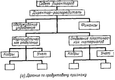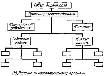 Рис. 12. Пересмотренная организационная структура фабрики по производству рейона Пересмотренная организационная структура, включающая эти предложения, представлена на рис. 12. Поскольку в данном случае это лишь иллюстрация, мы не рассматриваем трудности, связанные с внедрением этого решения. КООРДИНАЦИЯ И ГРУППИРОВКА ПО ОТДЕЛЕНИЯМ С ростом компании проблема координации функций становится все более трудной. По мере того как возрастает численность занятых и уровней управления, подразделения все более удаляются от уровня высшего руководства и питают все меньше симпатий к нуждам других подразделений. При определенных обстоятельствах такая ситуация может быть устранена с помощью группировки по отделениям. Если компания производит несколько продуктов, которые можно разделить на основе технологии или рынка, компания может быть расчленена на отделения по числу продуктов или рынков. Когда компания производит несколько различных продуктов, возможности получения экономии от увеличения масштабов деятельности при объединении всего производства или всего сбыта могут быть незначительны. Необходимость координации работ, связанных с каждым продуктом, может быть гораздо большей, чем работ, общих для всех продуктов. В этих условиях создание отделений по продуктам может улучшить координацию (см.рис. 13а). Оно подразумевает выделение всех главных работ, связанных с определенной группой продуктов, в одно подразделение, например фармацевтическое отделение, отделение красителей и т. д. Группировка по отделениям может быть осуществлена также по географическому признаку (см. рис. 13б), когда рынок делится на районы, в каждом из которых выполняются все основные работы, необходимые для производства и сбыта. Географическое разделение может оказаться единственным способом расширения рынка сбыта для продукции компании. Например, разделение по географическому признаку хлебопекарной фирмы, стремящейся завоевать национальный рынок, может быть вызвано ростом стоимости транспортировки хлеба и риска его порчи при перевозке. Группировка по отделениям может быть произведена и по нескольким признакам одновременно. Например, производство делится по продуктам, а сбыт - по географическому признаку. С созданием отделений остается проблема достижения координации как между отделениями, так и в масштабах компании в рамках каждой специализированной функции. Функциональная организация хороша там, где компания производит и продает узкий ассортимент однородных продуктов в одном секторе рынка. Проблема всегда возникает при разнообразии продуктов. Если фирма обслуживает несколько самостоятельных секторов рынка и каждый из них предъявляет особые требования, то организация производства и сбыта каждой группы продуктов требует особой стратегии и программы. Если фирма сохраняет функциональную структуру, могут вырасти гигантские функциональные отделы. Даже если вводится специальный институт координаторов, наступает момент, когда высшее руководство теряет способность координировать координаторов. Для эффективного внедрения различных стратегий и программ может требоваться разделение фирмы на отделения. Группировка по отделениям может быть особенно необходимой, если разные продукты производятся с помощью совершенно различных технологий (мно
