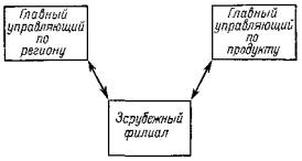 Рис. 13. Создание отделений Разумеется, при группировке по отделениям каждое из них несет в себе признаки функциональной организации, за исключением полностью централизованных функций, например финансов. Но для достижения координации фирма может использовать и смешанные способы группировки. Так, отделения фирмы могут быть сгруппированы по продуктовому признаку, но внутри каждого из них может применяться матричная структура (ниже мы рассмотрим ее более подробно), а подразделения сбыта могут специализироваться по потребителям или по секторам рынка. Когда фирма имеет много отделений, проблема координации может быть решена путем группировки сходных отделений под началом руководителя группы для уменьшения нагрузки на высшего руководителя. Из изложенного выше ясно, что функционально организованная компания с многопрофильным производством и многосекторным рынком сбыта испытывает затруднения в координации. Прохождение коммуникаций вверх и вниз по иерархии для достижения координации между функциями может привести к запаздываниям реакции на необходимые перемены и оказаться неэффективным для координации всех функций, связанных с осуществлением программы по конкретному продукту. Как заметили Дж. М. Стопфорд и Л. Т. Уэллс, сохранение функциональной структуры при разнообразии продуктов приводит к серьезному снижению управляемости и эффективности. Они утверждают, что фирма, осваивающая новую продукцию или заграничные рынки, испытывает трудности контроля и координации, которые едва ли могут быть разрешены в рамках иерархической функциональной организации. В случае выхода на зарубежный рынок организация зарубежного отделения либо даже сети отделений, производящих продукцию или торгующих по всему миру, может оказаться неудовлетворительной, поскольку координация между такими отделениями может быть все же недостаточной. Возникает необходимость организации управляющих комитетов, ответственных за координацию деятельности отделений. Безусловно, фирма может иметь международные продуктовые отделения, подразделенные внутри по секторам рынка. Однако даже этого может оказаться недостаточно, в связи с чем создается так называемая решетчатая структура, представленная на рис. 14, примером которой может служить организационная схема американской фирмы «Корнинг гласе». При такой схеме управляющий зарубежным филиалом, производящим и продающим некоторый продукт, может подчиняться в штаб-квартире компании главному управляющему по продукту и главному управляющему по сектору рынка сбыта одновременно. Эта схема именуется решетчатой структурой из-за пересечения ответственности.