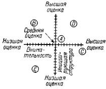 Рис. 16. Внимательность и «инициирующая структура» как независимые оси координат. Руководитель А имеет обе средние оценки. Руководитель С имеет высшую оценку по «внимательности» и среднюю по «структуре». (Из книги: R. Gagne, E. Fieishaman Psychology and Human Performance. 1959, by Holt, Rinehart & Winston, Inc , New York ) В исследовательском центре Мичиганского университета в результате выполнения аналогичной работы также были выявлены два фактора: 1. Ориентация на работников, т. е. такой стиль поведения, который показывает, что руководитель понимает интересы подчиненных, уважает их индивидуальность и принимает во внимание их потребности. 2. Ориентация на производство, при которой основное внимание уделяется производственным и техническим аспектам работы. Параметры, выявленные в обоих университетах, схожи, хотя «ориентация на работников» представляется несколько более широким понятием, чем «внимательность», а «ориентация на производство» - более объемным, чем «введение структуры». В обоих случаях эти параметры должны рассматриваться как независимые, а не как противоположные точки некоторого континуума. Руководитель может иметь высокую оценку по обоим критериям. Основным методом измерения этих оценок было анкетирование; один набор вопросов был составлен для подчиненных, а другой - для самого руководителя. Следовательно, значения этих параметров отражают восприятие и установки как тех, так и других. КЛАССИФИКАЦИЯ К. ЛЕВИНА Другим подходом к описанию поведения лидеров является классификация Курта Левина (1944 г.). Левин выделил следующие стили лидерства: демократический, автократический и попустительский (laissez faire). В этой классификации акцент делается на степень влияния подчиненных или руководителя на принимаемое решение. При автократическом лидерстве решение принимается руководителем в соответствии с его целями, в то время как при демократическом лидерстве решение принимается группой.