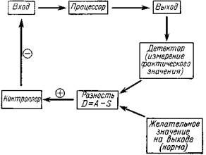 Рис. 25. Система с замкнутым контуром и отрицательной обратной связью На рис. 25 представлена модель системы с замкнутым контуром и отрицательной обратной связью; модель более дескриптивна, чем та, которая выражается формулой D = A-5. Она может представлять машину с встроенным механизмом контроля, такую, как термостат, регулирующий температуру помещения. На входе системы - затраты труда и топлива, необходимые для поддержания работы печи. Когда фактическая температура отклоняется от 70°, некоторое контрольное устройство включает или выключает печь. Эта система представляет собой замкнутый контур, так как значения затрат труда и топлива на входе зависят от фактического выхода тепла. Если бы вход видоизменялся в результате непосредственного восприятия реальных возмущающих воздействий вне помещения, то система была бы открытой. Системы с открытым контуром могут быть более эффективными в определенных хозяйственных ситуациях, так как в отличие от систем, в которых регулирование осуществляется на основе значений ошибки, они теоретически могут осуществлять совершенный контроль. Все системы контроля с замкнутым контуром обратной связи имеют следующие характеристики: 1) наличие нормы, которая фактически задает условия, соответствующие успешному выполнению работы, В идеале нормы основываются на анализе и измерении, но полезными могут быть и дескриптивные нормы; 2) измерение фактического или предсказанного состояний или эффективности контролируемого объекта; 3) сравнение нормы с результатом измерения (или фактическим состоянием) для оценки степени отклонения; 4) директива контролирующего контролируемому. Хотя нередко утверждают, что целью директивы является минимизация расхождения между нормой и фактическим значением, это не всегда так. Во многих ситуациях контролируется отклонение только в одну сторону. Неопределенность при принятии решений обусловлена как неоднородностью окружающей среды, так и быстрыми изменениями состава задач. Эта неопределенность может приводить к бездействию, и когда наконец действие предпринимается, оно уже не соответствует изменившейся ситуации. Если изменения происходят быстро, то для того, чтобы система оставалась устойчивой, обратная связь также должна быть быстрой. Такой обратной связью и механизмом, настроенным на изменения вероятного типа и масштаба, обладает адаптивная система. В общем, чем более разнообразны вероятные ситуации, тем шире диапазон требуемых ответных реакций. Системы контроля служат нескольким целям. 1. Служат для мотивации и поощрения желательного поведения. 2. Поощряют делегирование. Нежелание делегировать полномочия объясняется боязнью потерять контроль, подкрепляемой сознанием того, что делегирование не освобождает от обвинений в случае неудачи. Из всех управленческих систем контроля особенно действенна в поощрении делегирования и способствует децентрализации бюджетная система. Известный экономист Нейл Чемберлен объясняет это следующим образом: «По мнению экономистов неоклассической школы, единственным бесспорным ограничением на расширение любой компании является кривая предельных затрат, которая раньше или позже сдерживает подъем, так как все факторы не могут расти пропорционально, и лимитирующим фактором окажется, скорее всего, управление. Прирост тр